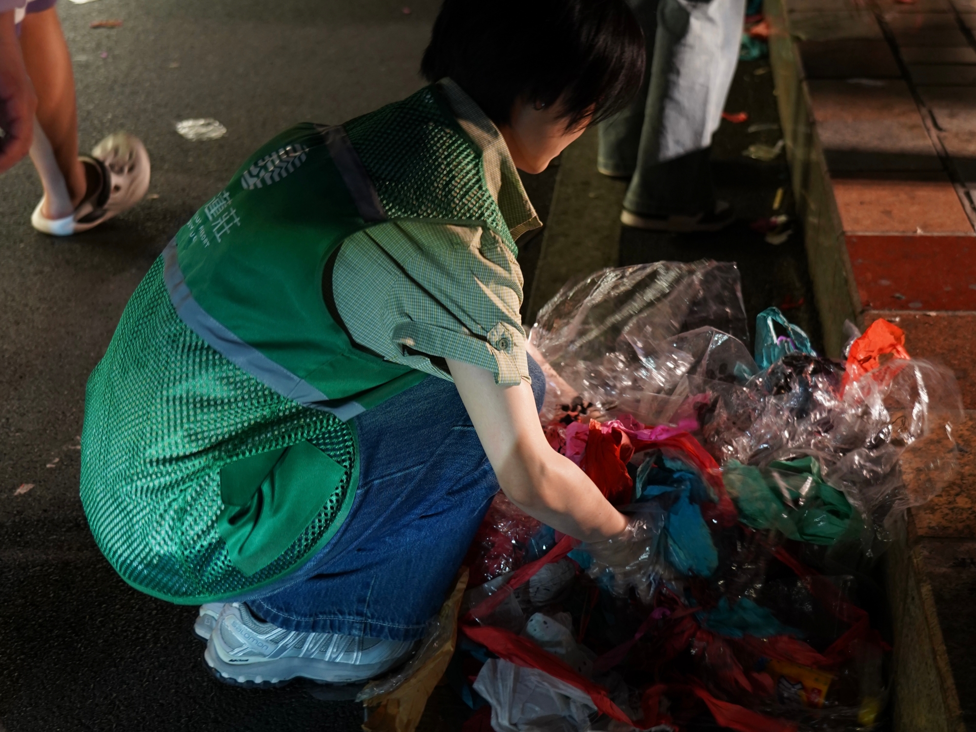 作为这片美丽风光中的“亲历者”与“守护者”,他们俯身捡拾四处散落的孔明灯灯罩、竹制支架、及包装袋等遗留废弃物。面对落入树梢和绿化带深处难以清理的杂物,酒店人刻在骨子里的细致发挥了作用——大家分工协作、耐心清理,以实际行动践行环保理念。
