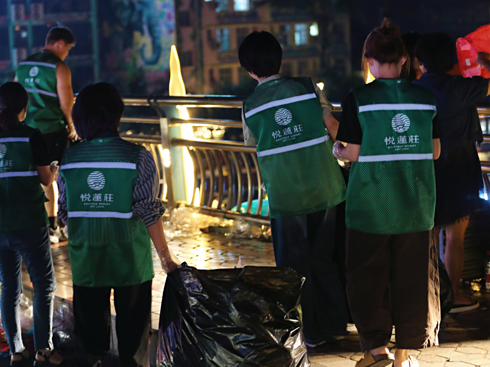 为了让西双版纳的城市在天亮之前恢复干净整洁,景洪的环卫工人们会连夜奋战。今年,悦莲庄酒店集团自发组织了旗下“西双版纳悦莲庄菠萝度假酒店”与“西双版纳悦莲庄莲府度假酒店”的员工,奔赴告庄西双景及西双版纳大桥区域,开展了主题为“只留美好不留痕”的环保公益行动。
